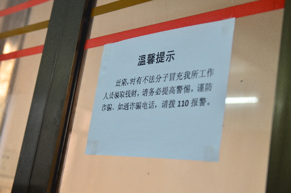目前为止诈骗案发生6起,被骗财物案2起,在张贴提示后没再收到成功被骗财物案件,图为张贴的温馨提示