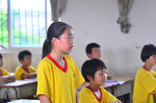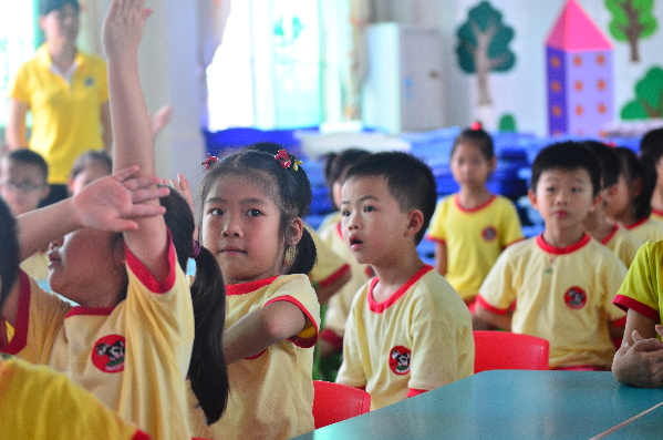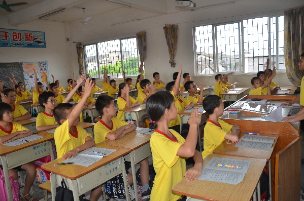 崖门镇的食品药品安全从娃娃抓起。图为可爱的孩子们在老师提问后纷纷举起手要回答食品药品安全知识