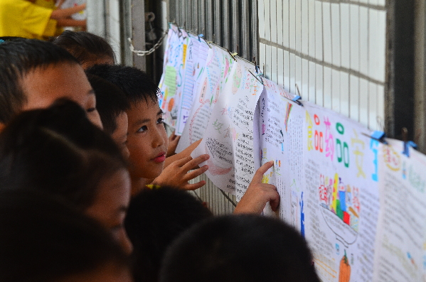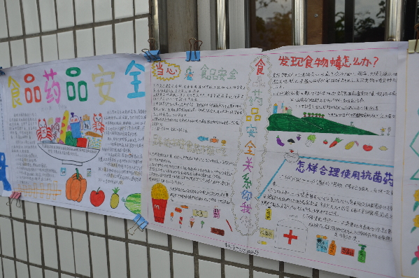 在另一处的墙上挂满了学生们自己创作的食品药品安全知识页