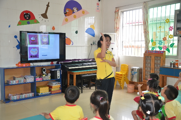 食品药品安全不单单进小学,还进了幼儿园,图为崖门某幼儿园教师正在普及食品药品安全知识