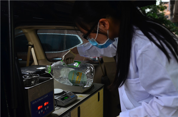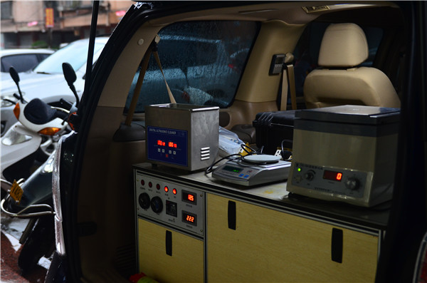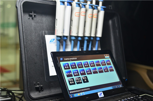 抽检的样品需要送到“食品快检车”上检测,车身后半部分复杂的检测仪器与试剂让人惊讶不已