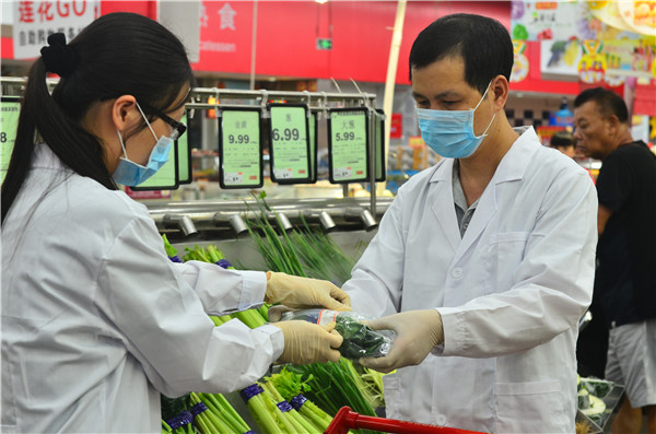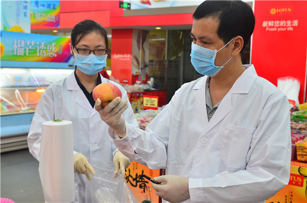 在一家超市里,监管人员正在抽查月饼