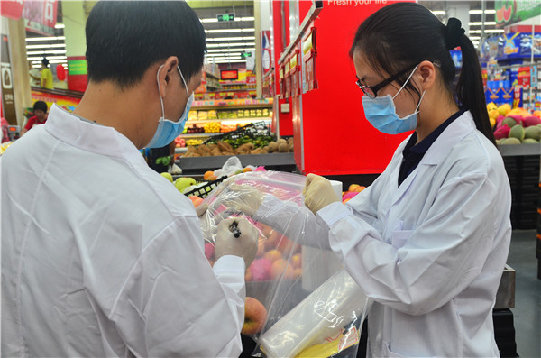 为做好中秋节食品药品安全监管工作,节前监管人员就对各大超市、市场以及商店进行了全面又仔细的取样快检,图为监管人员定点取样