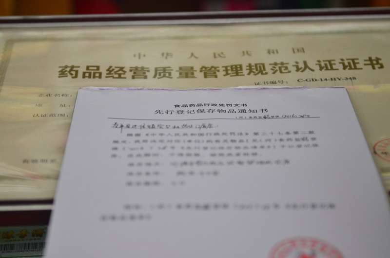 因为该药店涉嫌超范围经营药品,监管人员现场对超范围销售药品进行先行登记保存,图为已经填写完毕的处罚文书