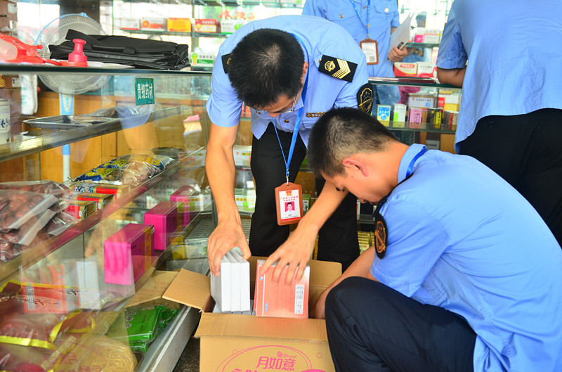 因为该药店涉嫌超范围经营药品,监管人员现场对超范围销售药品进行先行登记保存,图为监管人员正在填写处罚文书