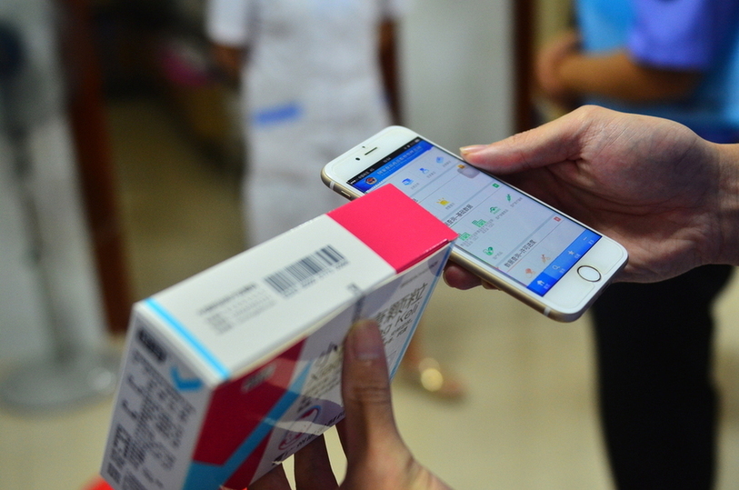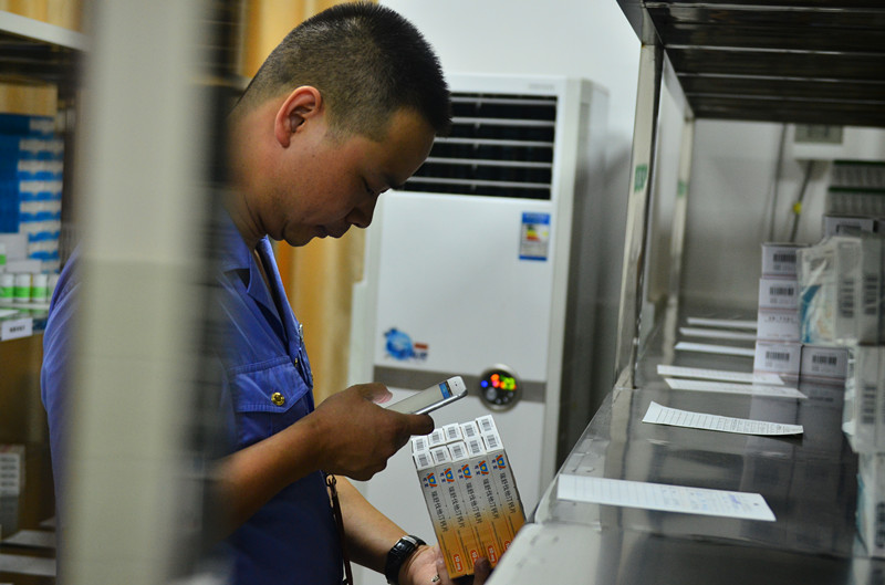 在药库的另一侧,监管人员正在用手机扫描药品的二维码信息检查药品的具体信息