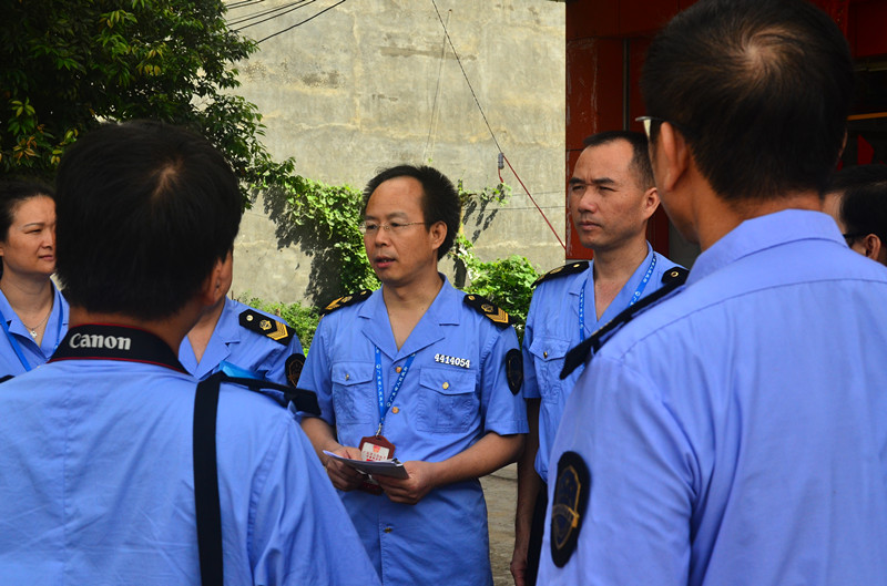汽车在高速公路上行驶了一个小时后终于到达了今天飞行检查工作的目的地——连平县忠信镇,吴仕延副局长立即把此次飞行检查工作组分为食品组和药械组,图为分配任务