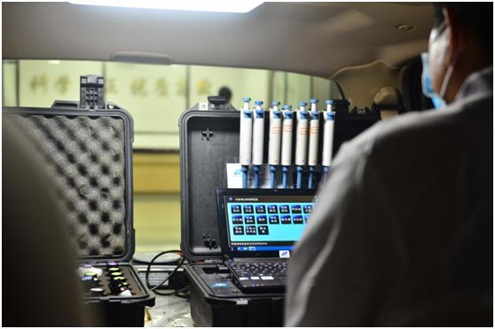在狭小的空间里,摆放着许多复杂的试验设备,这些神奇的设备是食品安检的第一道门,图为工作人员正在快检车上检测食品