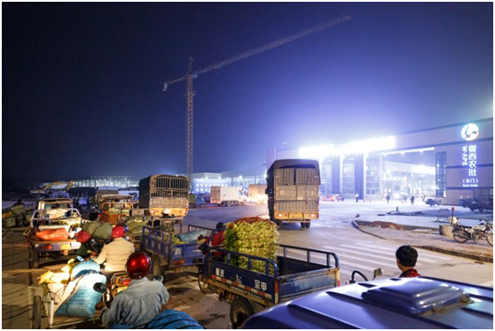 一到晚上,粤西农产品批发交易中心就灯火通明,人如流水车如龙。其果蔬交易不仅覆盖茂名市各区、县级市,还承接和辐射全国各地,已然成为茂名农贸交易市场的“旗舰”。