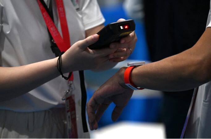 公路自行车赛道上的口岸区域安装了无线射频识别系统(RFID)。这套系统能在选手经过时自动读取车手与车的电子芯片,并即时回传到后台边检、海关系统进行同步核验,形成全程闭环管理。图为志愿者为公路自行车男子个人赛的参赛选手佩戴通关手环。