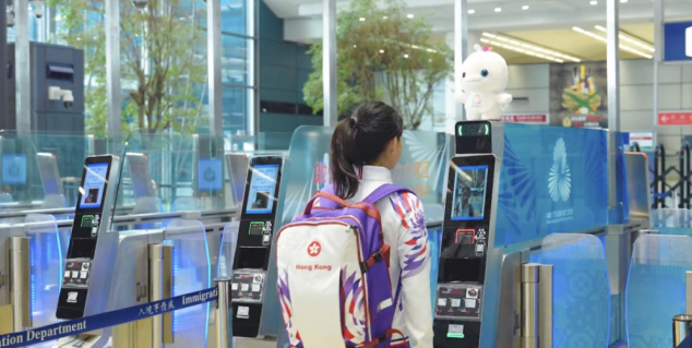 在全运会中注册了的运动员及相关人员,可以在“出入境专属通道”快速通关。香港入境处在香港国际机场、高铁西九龙站、港珠澳大桥及深圳湾口岸四个主要口岸设置“出入境专属通道”,提供16条自助通道。图为赛事注册人员在专属通道快速通关。