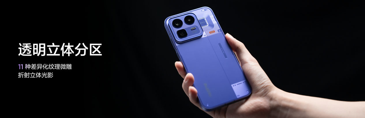 真我Neo8在外观设计上同样带来全新惊喜。真我Neo8采用透明玻璃后盖,新一代漫反射工艺让光线穿透后形成层次丰富的明暗变化,呈现立体金属质感。行业首创单层透明立体分区工艺,通过11种纹理相互衔接将后盖玻璃划分为多个视觉功能区,在光照下呈现清晰的层次分界,挑战透明设计工艺天花板。细节方面,透明魔方Deco遵循全透明美学理念,“Make it real.”铭牌即是品牌态度标识更是灵魂点缀。