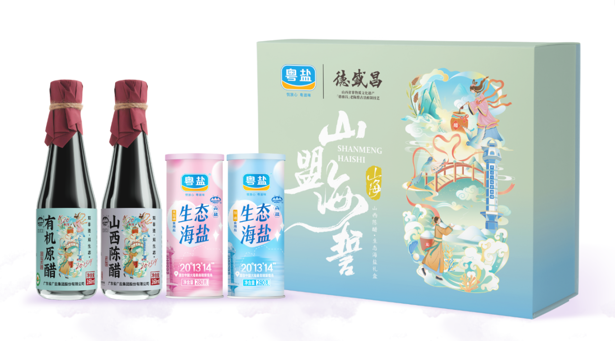 礼盒包装设计独具匠心,巧妙融入七夕文化元素,精选产自中国大陆最南端的粤盐生态海盐,特别添加生态海盐酿制的山西陈醋。产品组合不仅体现“粤盐”与“德盛昌”两大品牌“老字号、非遗技艺、生态原产地”优良基因的深度契合,更具有生态海盐产地坐标北纬20°13′14″、陈醋酸度5.20°等特殊符号的浪漫巧合,既贴合现代人对健康生态产品的消费需求,又顺应当下大众对国潮文化的情感归属与共鸣,使传统产品更好满足现代消费者的多样化需求,带来更优质的产品体验。