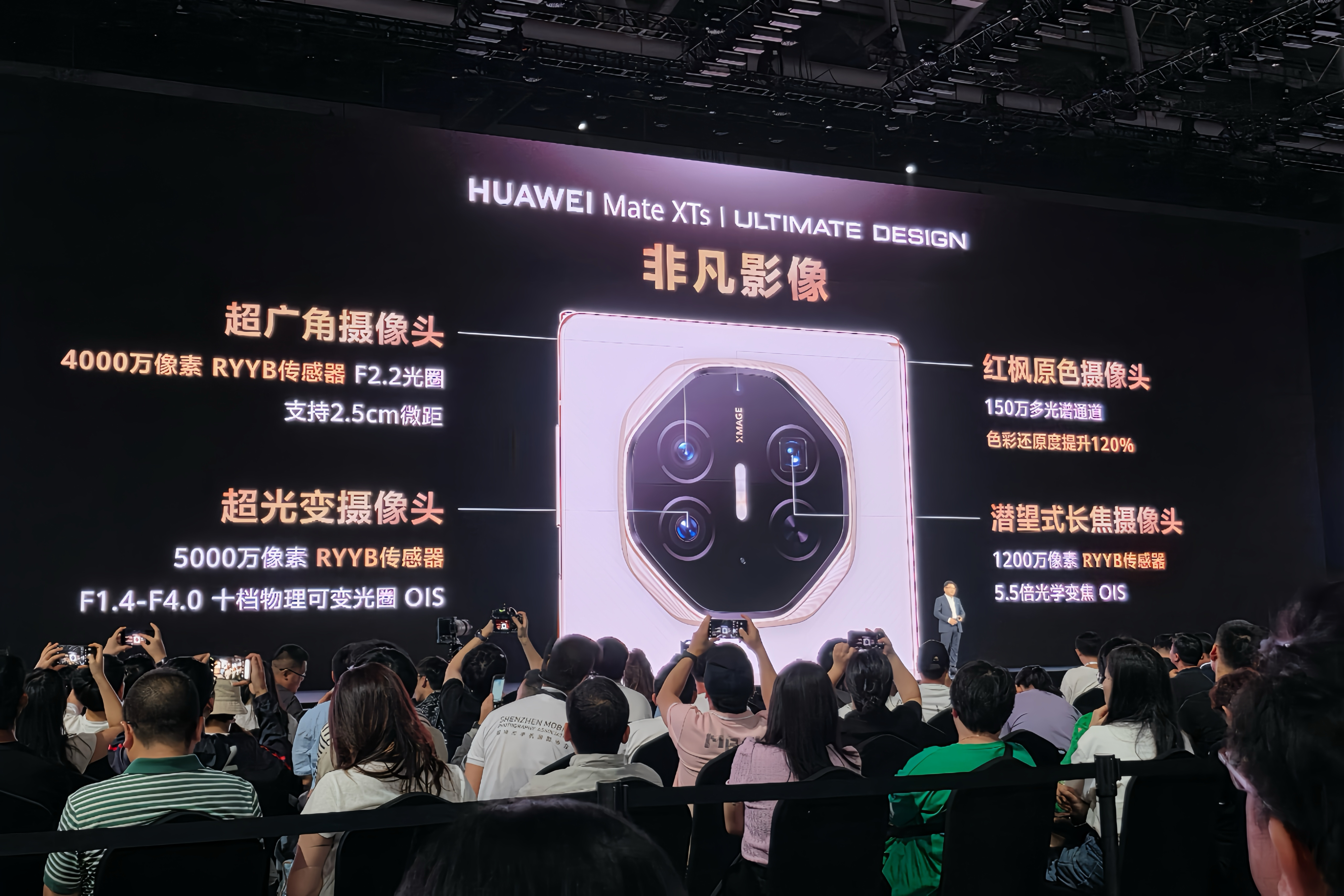 摄影方面,华为Mate XTs非凡大师影像体验能力再度提升,将超光变主摄、超广角镜头、长焦摄像头升级为RYYB传感器,同时将超广角镜头分辨率提升至4000万像素,进光量提升40%。新增红枫原色摄像头,精准识别全局色彩信息,色彩还原度提升120%。
