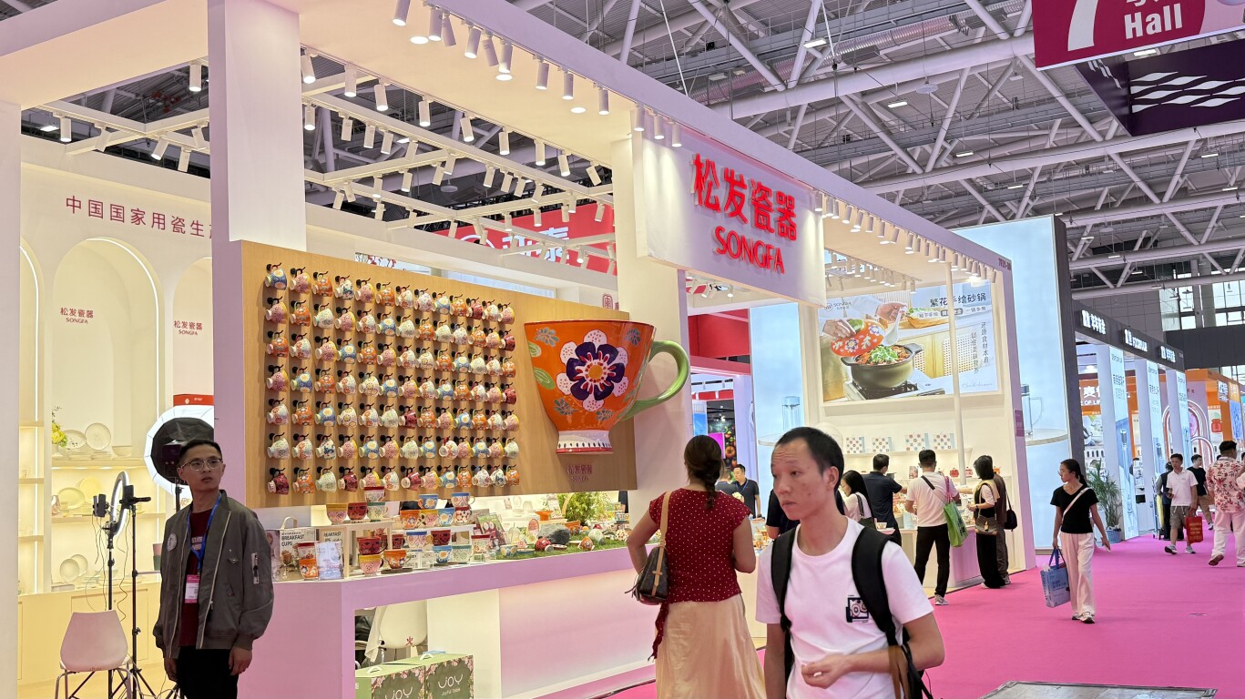 潮州市松发陶瓷有限公司将“出口转内销”的爆款手绘早餐杯放在展区“c位”。图/刘思敏摄