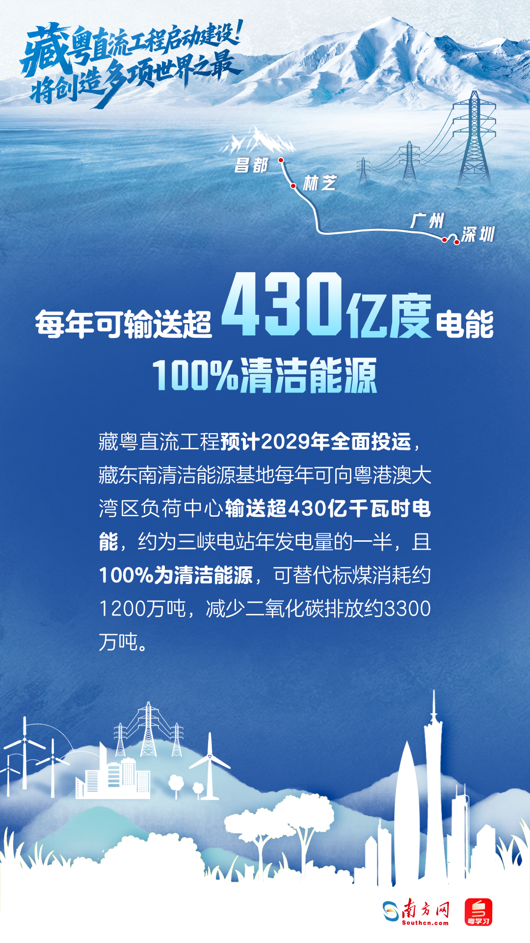 藏粤直流工程预计2029年全面投运,届时藏东南清洁能源基地每年可向粤港澳大湾区输送超430亿千瓦时电能,为“再造一个新广东”提供坚强的绿色低碳能源保障。