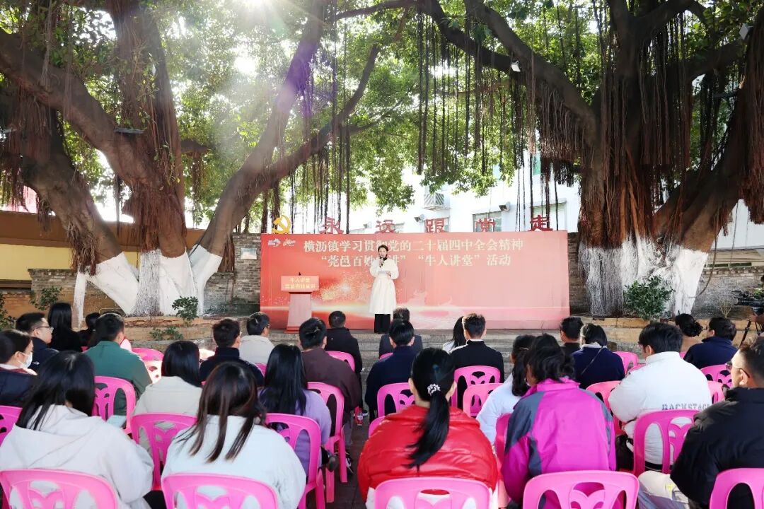 1月7日,在隔坑村榕树下,东莞市横沥镇学习贯彻党的二十届四中全会精神“莞邑百姓宣讲”“牛人讲堂”活动热烈开讲。活动打破传统会场限制,将宣讲台搬到村民家门口的榕树下,以“身边人讲身边事”的形式,推动全会精神从“文件语”走向“家常话”。