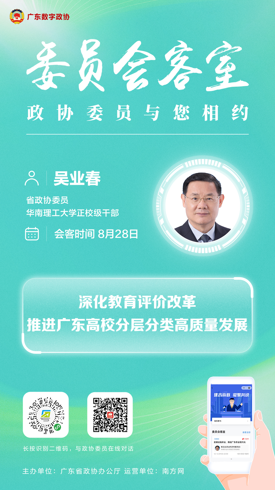 华南理工大学将立德树人成效作为根本标准,加快构建符合国情、校情的新时代教育评价体系;广州大学以学生发展评价为驱动,实施“五育并举”全学段全覆盖育人模式改革;广东科学技术职业学院通过构建“三个共同体”打造国家职业教育教师教学创新团队……作为国家教育评价改革试点省,广东先行先试,用好高等教育评价改革的“指挥棒”,着力破解“五唯”难题,推动高校分层分类、特色发展,绘就了教育评价改革的创新图景。今天,省政协委员、华南理工大学正校级干部吴业春,邀您云端畅谈“深化高教评价体系改革,推进广东高校分层分类特色发展”这一话题。
