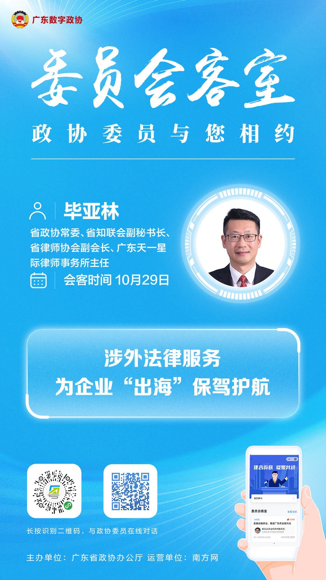 广州实施“法治护航 商通四海”助企“出海”工程;中山为2000余家企业提供跨境投资专项服务;珠海助企公共法律服务团进驻经贸展会;东莞构建“公证+产业链”融合服务体系……面对当前复杂多变的国际经贸环境,广东各地纷纷出招、积极作为,推出了一系列颇具成效的改革举措,以高质量涉外法律服务为高水平对外开放赋能,助力更多企业扬帆“出海”、行稳致远。今天,省政协常委、省知联会副秘书长、省律师协会副会长、广东天一星际律师事务所主任毕亚林邀您云端畅聊“涉外法律服务为企业‘出海’保驾护航”这一话题。