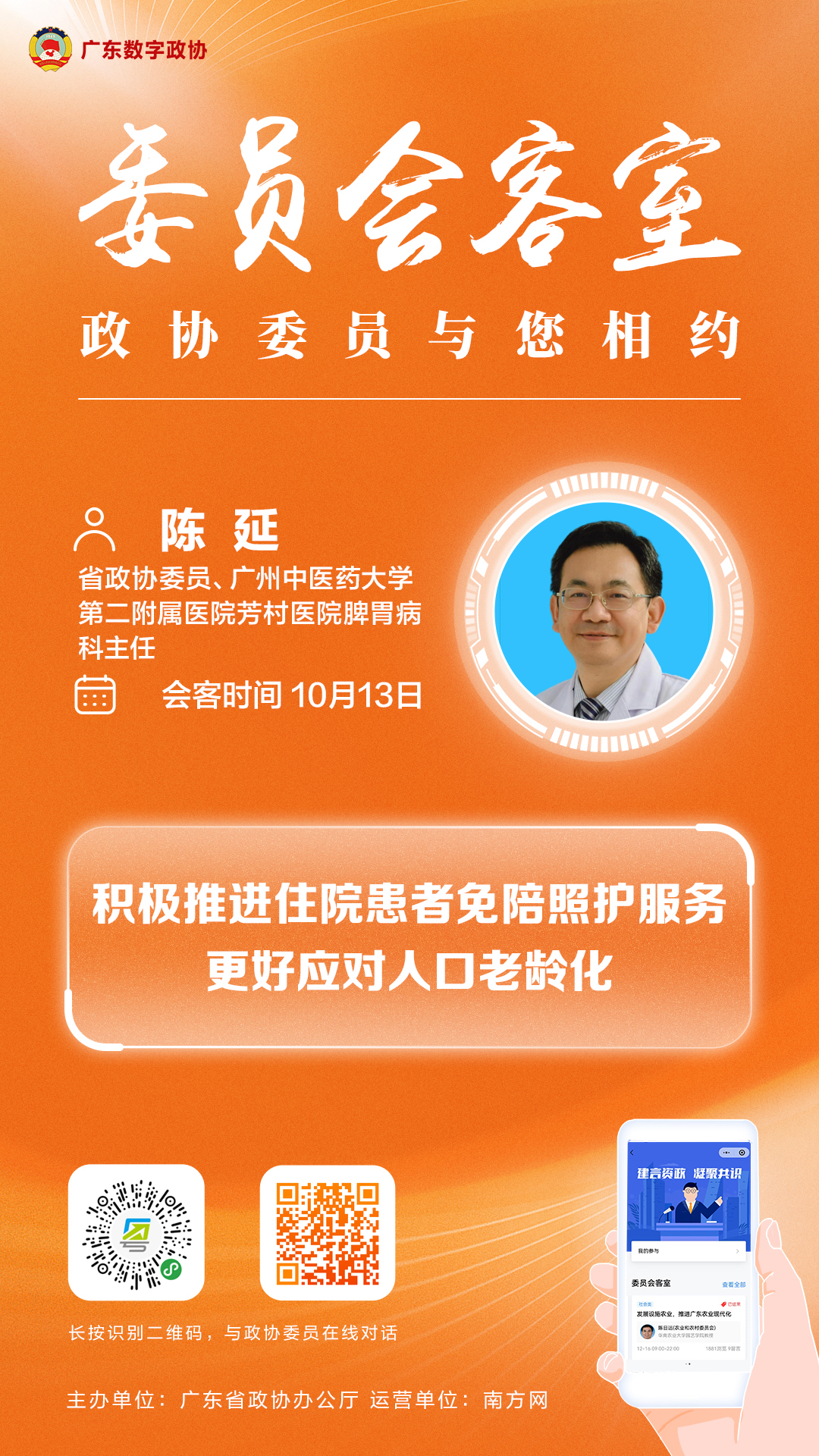 随着人口老龄化程度加深,“一人住院,全家奔波”正成为越来越多家庭的“忧心事”。家庭照护不仅耗费家属大量精力与时间,也因照护专业性不足,往往难以达到理想的康复效果。今年4月,免陪照护服务在全国范围内开始试点。这一措施不仅有助于减轻家庭在时间、经济和照料上的多重负担,也让患者获得更专业、安全的照护,为构建老年友好型社会迈出重要一步。如何进一步完善制度设计、加强人员培训?如何将“免陪照护”办成一项百姓满意、医院可行、社会支持的民生工程?今天,省政协委员、广州中医药大学第二附属医院芳村医院脾胃病科主任陈延,邀您在线交流探讨“积极推进住院患者免陪照护服务,更好应对人口老龄化”这一话题。