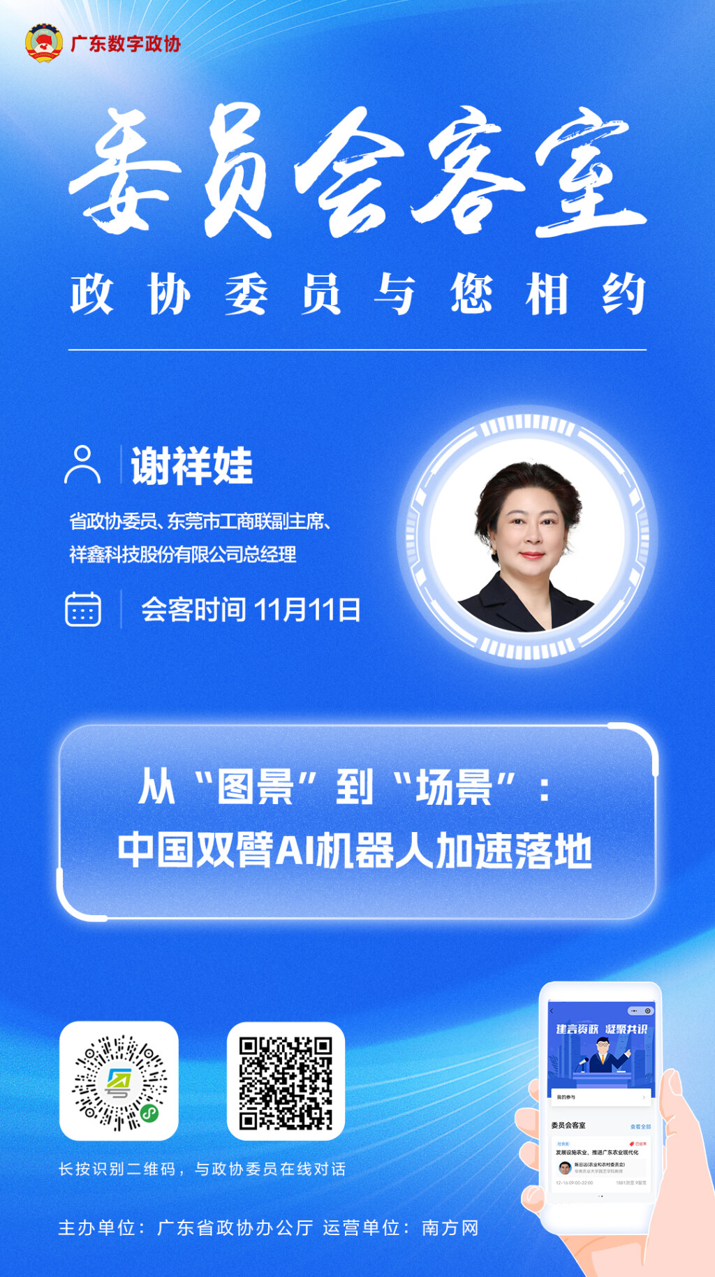 在广东的制造业车间,一幅智能新图景正加速成为现实:智能双臂机器人——这种模仿人类双臂协作、集视觉感知、AI决策与精密控制于一身的先进装备,已从实验室的“概念图景”大步迈入工厂的“应用场景”。它们在东莞的精密电子产线执行装配,在深圳的智能工厂完成自主检测,精准契合制造业对柔性化与高协同性的迫切需求。这一加速落地,既源于技术层面对“手眼脑”协同瓶颈的持续突破,也得益于“产学研”协同创新的生态支撑。如今,双臂AI机器人正以扎实的应用成效,成为推动广东产业智能化升级、培育新质生产力的关键力量。今天,省政协委员、东莞市工商联副主席、祥鑫科技股份有限公司总经理谢祥娃与您在线交流“从‘图景’到‘场景’:中国双臂AI机器人加速落地”这一话题。