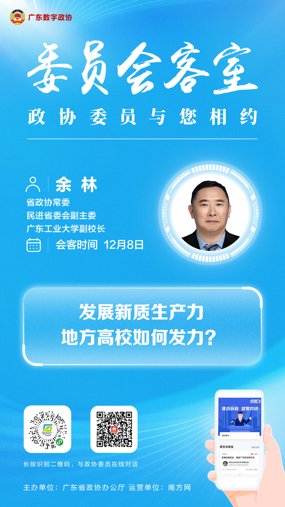 春耕时节,两台无人驾驶水稻直播机依托北斗导航,在田间自主行进、精准播种。这正是中国工程院院士、华南农业大学教授罗锡文团队打造的首个水稻“无人农场”,实现了从耕作到收获的全流程无人化作业;在智能制造一线,焊接、打磨、喷涂、搬运等一系列工序中,工业机器人正高速运转。背后支撑它们的,是广东工业大学黄运保教授团队研发的机器人工业软件,其成果已广泛应用于重工、家居、船舶、工程建设等十多家行业龙头企业。新质生产力作为推动高质量发展的强劲动力,对高校赋能区域创新、培养复合型人才提出了更高要求。地方高校应如何发挥自身优势,精准对接产业需求,为发展新质生产力注入持续动能?今天,省政协常委、民进省委会副主委、广东工业大学副校长余林邀您一同探讨。