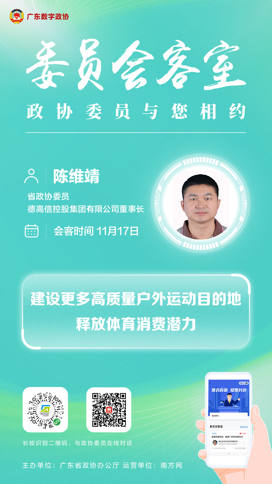 惠州山地间的徒步赛道、汕头南澳岛的滨海骑行线、中山沙溪桥下的“村BA”赛场、清远山谷的漂流河道、韶关丹霞山的徒步秘境……如今,“体育+旅游”“体育+乡村”加速融合,高质量户外运动目的地不再是单一赛场,而是集休闲、社交、消费于一体的生活空间。步道蜿蜒串联自然,赛事点燃全民热情,户外装备、民宿餐饮、研学体验等消费场景持续扩容,让运动活力变身经济动力。今天,省政协委员、德高信控股集团有限公司董事长陈维靖与您在线交流“建设更多高质量户外运动目的地,释放体育消费潜力”这一话题。