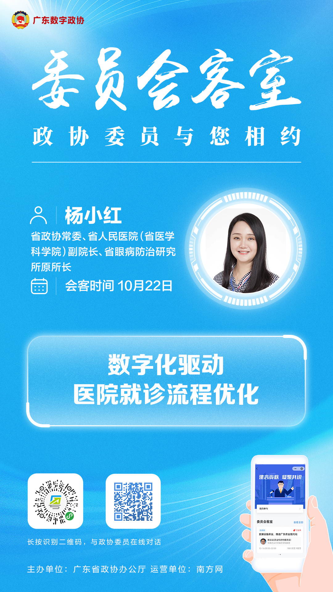 在5G、人工智能等新兴技术的推动下,数字化、网络化、智能化加速融入医疗场景,智慧医疗建设不断深化,群众看病就医的便捷性与体验感大幅提升。例如,广东省人民医院开展了39个病区一站式结算,从“病区结算准时准点、足不出户”推广至“自助结算随时随地、一键办理”,改变了患者需去窗口排队结账的传统模式,切实做到让患者少跑腿,免去窗口排队等候之苦,给人民群众带来便利。让数据多跑路,让百姓少跑腿。今天,省政协常委、省人民医院(省医学科学院)副院长、省眼病防治研究所原所长杨小红邀您云端畅聊“数字化驱动医院就诊流程优化”这一话题。