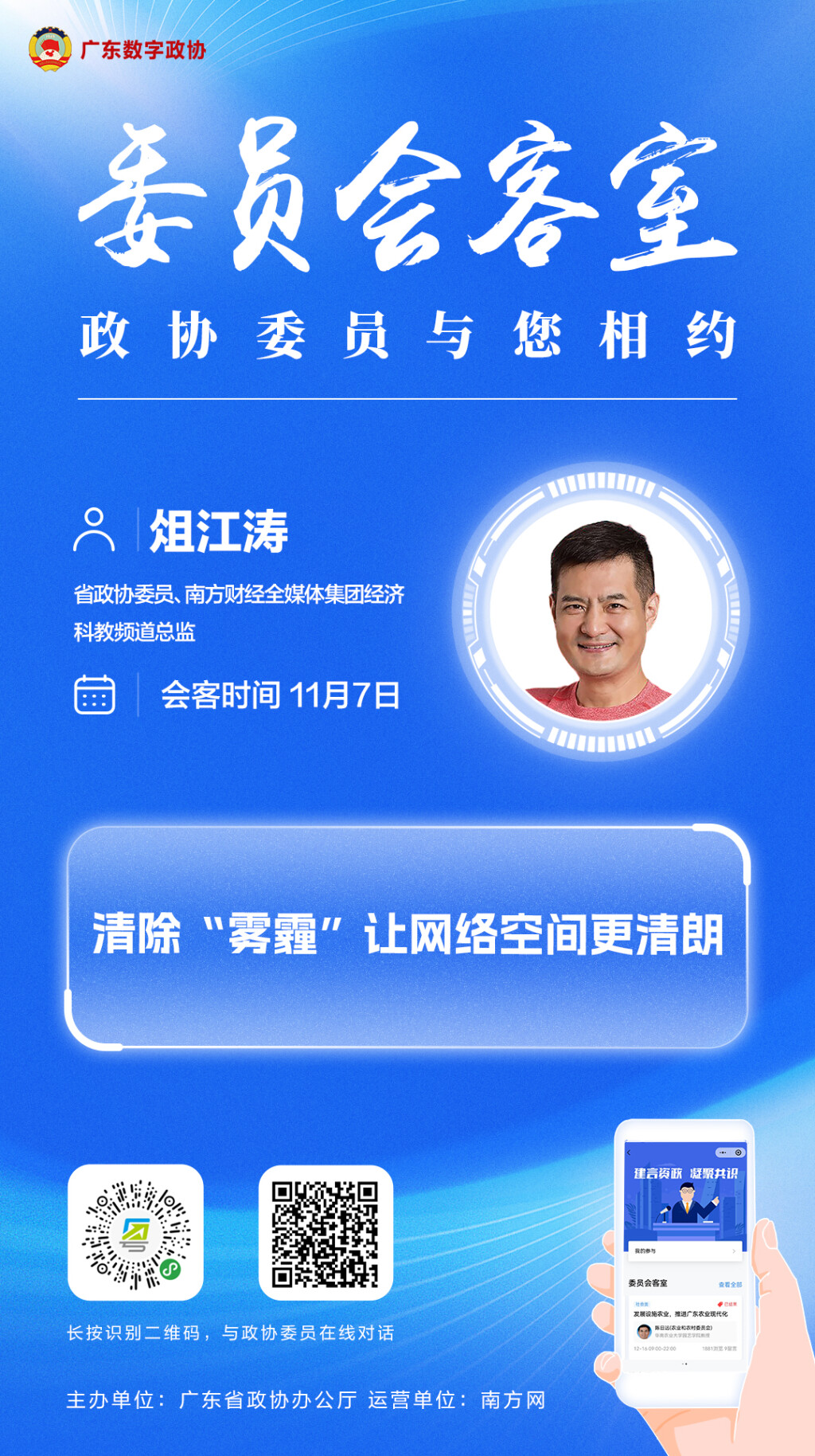 当前,网络空间已深度融入日常生活,成为人们获取信息、沟通交流不可或缺的重要领域。伴随互联网的飞速发展,不良信息泛滥、虚假内容传播、网络暴力蔓延等乱象也如影随形,这些“网络噪声”,逐渐演变为“精神雾霾”,亟需依法施治、正本清源。近年来,国家推进“清朗”系列专项行动,聚焦人民群众反映强烈的网络突出问题,重拳出击持续加大整治力度,网络生态持续向好,网络空间日渐清朗,系列行动取得积极成效,形成有力震慑。今天,省政协委员、南方财经全媒体集团经济科教频道总监俎江涛,邀您在线交流如何清除“雾霾”,让网络空间更清朗。