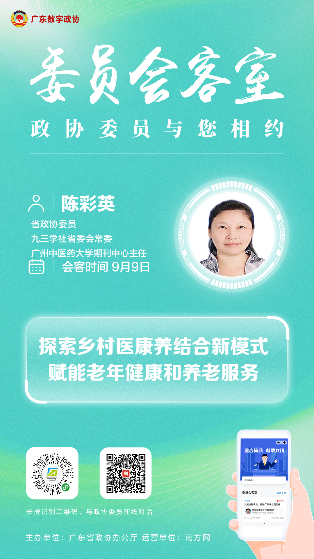 岭南大地乡野之间,一场关乎养老的变革正悄然展开。面对千万老年人口的现实需求,广东将积极应对人口老龄化与乡村振兴紧密结合,以南粤智慧探索“医康养”融合服务新模式,为全国农村养老实践书写鲜活注脚。清远连樟村打造田园康养综合体,韶关丹霞山开发地质疗愈项目,潮州凤凰山推出茶禅养老民宿……在“百千万工程”推动下,优质医疗资源持续下沉,老年人既能在家门口就医看病,也能在山水间享受“医康养”一体式服务。今天,省政协委员,九三学社省委会常委,广州中医药大学期刊中心主任陈彩英邀您在线讨论“探索乡村医康养结合新模式,赋能老年健康和养老服务”这一话题。