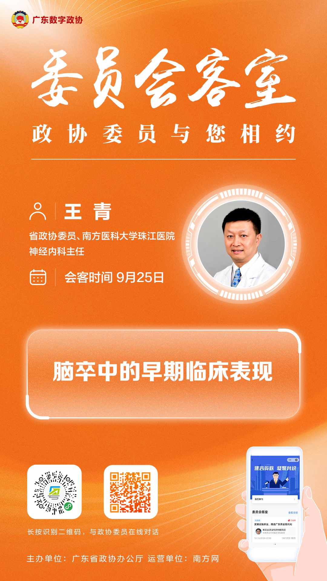 脑卒中俗称“中风”,起病急、危害大,被称为“人类健康的头号杀手”。据世界卫生组织统计,全世界每六个人中就有一人可能罹患脑卒中,每六秒钟就有一人死于脑卒中。近年来,脑卒中发病率呈上升趋势,在我国二级以上医院住院患者疾病诊断数量中,脑卒中位居首位,也是导致我国居民死亡的前三位病种之一。识别脑卒中的早期症状和及时救治可显著降低致残与死亡率,比如“中风120”口诀可快速识别脑卒中,即“看到1张不对称的脸”“查两只手臂是否有单侧无力”“聆听讲话是否清晰”,越早识别这些症状,就越能争取黄金时间及时就医。今天,省政协委员、南方医科大学珠江医院神经内科主任王青邀您在线了解“脑卒中的早期临床表现”。